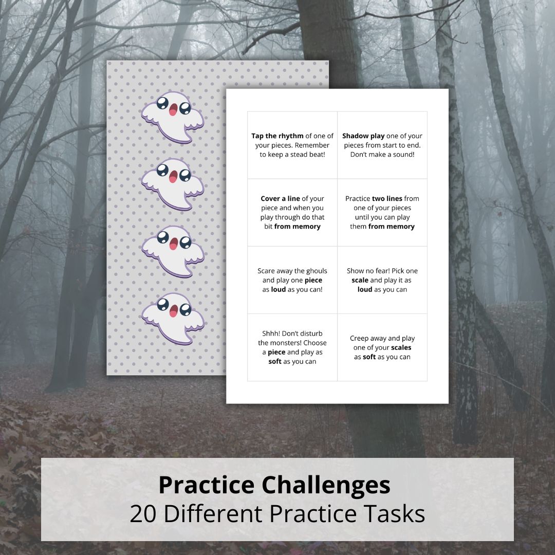 If you’re wanting your students’ practice time to have clear goals and effective tasks, then send them on a spooky adventure as they escape a haunted house riddled with monsters. With every roll of the dice players draw a card and complete the practice task shown, trying to reach safety and avoid the monster which is pursuing them across the board.